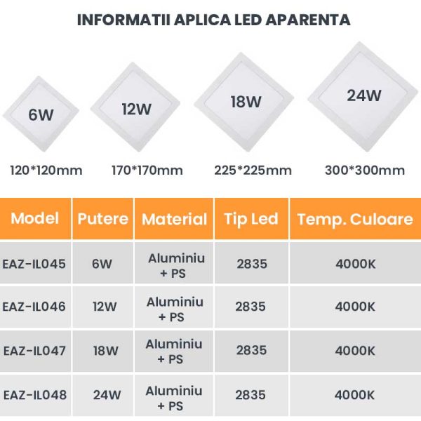 - 1 x Aplica Led Patrata,Aparenta, Driver IC inclus, Putere 6W