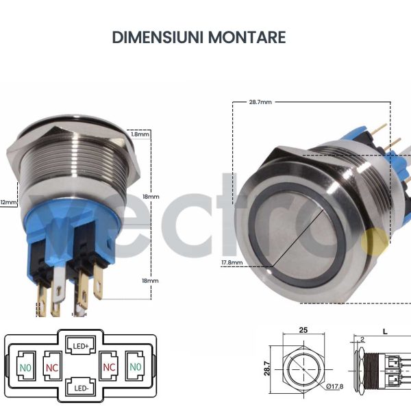 Butonul Push are dimensiunea de montare de 22 mm, filet M22 mm, cu buton plat,inel iluminat,conectare 5 pini (2 pini pentru LED, 3 pini pentru contact). Acest buton push are 2 tipuri de contacte NO (normal deschis) sau NC ( normal inchis). In functie de nevoile dvstra conectati butonul in asa fel incat sa obtineti tipul de contact dorit.