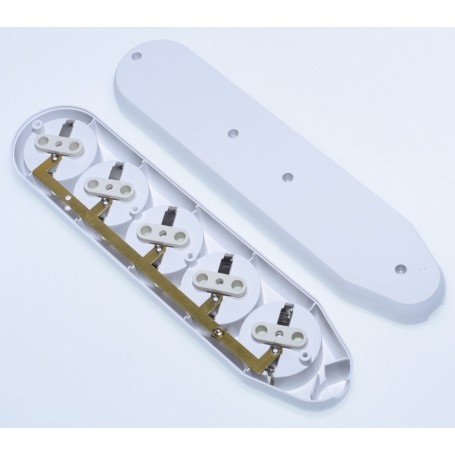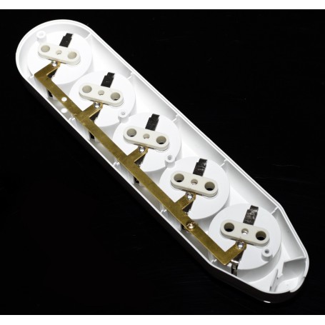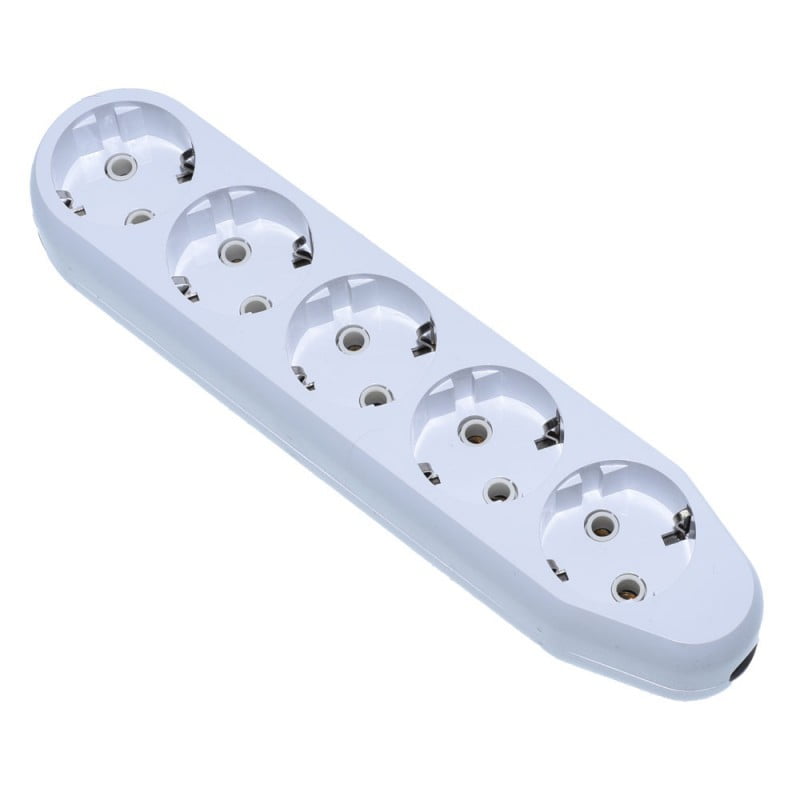 Cap multiplicator cu cinci posturi de intrare tip Schuko așezate în linie, pentru ștechere cu impamantare. Aceasta are si contacte de protectie din alama pentru siguranta copiilor.