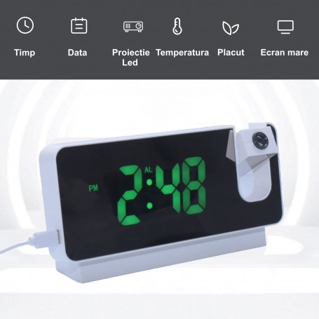 Ceasul cu afisaj digital cu LED Verde si proiectie cu LED de culoare rosie este foarte util, deoarece are functii multiple precum: ceas, alarma, data si termometru. Proiectia cu ore si minute se poate realiza pe orice suprafata, in special pe tavan sau peretii din camera respectiva.