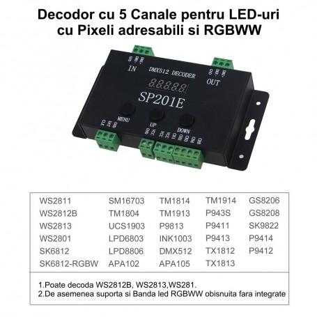 Decodor DMX512 pentru controlul benzilor cu led tip pixel digital, compatibil pentru aproape toate ledurile cu circuite integrate, controlate cu ajutorul unuI fir sau doua cum ar fi: WS2811, WS2812B, WS2801, SK6812, RGBW, WS2813, LPD6803, LPD8806, APA102, TM1913, UCSSM19503, DMX19503, etc.