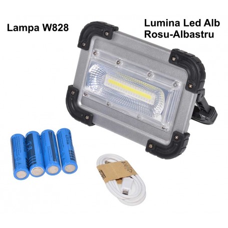 Lampa de lucru cu led COB 2 in 1 de 30W cu lumina alb-rece pe modulul central si 3 functii de iluminat: 100%, 50% si intermitent. Rama exterioara a led-ului se aprinde in culorile albastru si rosu cu lumini de avarie si semnalizare. Dupa o incarcare de 3 ore acesta poate avea o durata de functionare intre 5 si 8 ore. Alimentarea se va face prin mufa micro-USB cu ajutorul cablului inclus la o tensiune de 5V DC.