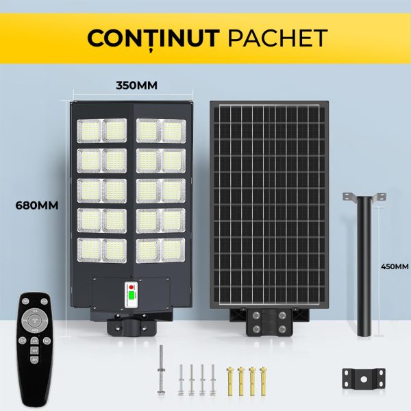 Transformă orice spațiu exterior cu Lampa Solară cu Senzor de Mișcare și Telecomandă, 800 LED-uri, 1000W, o soluție modernă și ecologică pentru iluminarea eficientă a zonelor rezidențiale și comerciale. Dotată cu tehnologie avansată, acest corp de iluminat funcționează autonom, oferind lumină puternică pe tot parcursul nopții.