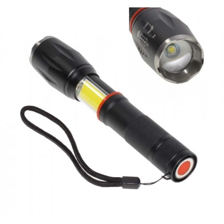Lanterna metalica de mana profesionala cu Zoom cu led XML-T6 are 6 faze de lumina: puternica 100%, slaba 50%, foarte slaba 25%, intermitenta de avarie (pentru situatii de urgenta) si intermitenta de semnalizare a pozitiei si lumina COB laterala de veghe. Cu ajutorul lupei integrate lumina este concentrata sau disipata, prin tragerea capului de proiectare. Astfel se realizeaza un zoom mecanic.